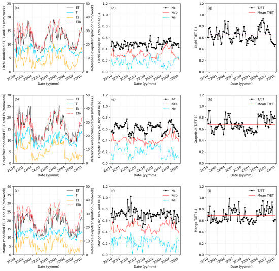 The litchi, grapefruit and mango , , and showed maximum weekly total value in the summer season (November–March) and a minimum value in the winter season (May–July), except in October 2021 where a decrease was observed in , , as shown in Figure 8a–c. The decrease in , , was attributed to the sharp decrease in , which caused a reduction in the atmospheric evaporative demand. The , , and for the three crops followed the same seasonal trend as the . Maximum for litchi, grapefruit and mango occurred in the summer season, giving cumulative totals of 10.5 mm/week, 15.8 mm/week, 16.0 mm/week, respectively, and minimum was recorded in the winter season with values of 4.0 mm/week, 5.9 mm/week and 7.0 mm/week, respectively. The annual average modelled transpiration for litchi, grapefruit, and mango was approximately 397 mm, 541 mm, and 624 mm, respectively.