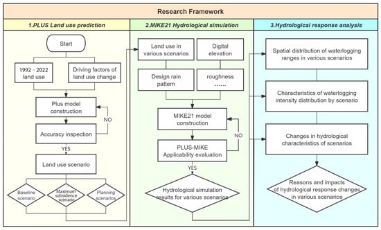 The PLUS model and the MIKE model were integrated for the research to evaluate the variations in hydrological characteristics in the Bahe River Watershed under different future development scenarios. Among them, the PLUS model was employed to predict the land use in the Bahe River Watershed under various development scenarios, and the MIKE model was utilized to simulate the hydrological responses under different land use changes. Finally, the results were analyzed in terms of hydrological elements and hydrological characteristics. The flow chart is presented in Figure 2.