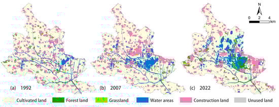 (1) Land use data. The main data used in this research are the Landsat series remote sensing images of 1992, 2007, and 2022, which were obtained through the Resource and Environmental Science Data Platform of the Chinese Academy of Sciences, with a spatial resolution of 30 m [36]. ENVI 6.1 software [37] was utilized for preprocessing, such as atmospheric correction and radiometric calibration, and the remote sensing images of the study area were subjected to supervised classification [38]. The supervised classification method employed in this research is the Maximum Likelihood Classification (MLC). This method is grounded in the Bayesian decision theory [39]. The likelihood of a given pixel belonging to a particular training sample is computed. Eventually, the pixel is grouped into the category with the highest likelihood value [40]. Based on the land use classification method of the Chinese Academy of Sciences [41] and the characteristics of land use in the study area, the land use in the study area was classified into six types: cultivated land, forest land, grassland, water area, construction land, and unused land. Integrating the physical geographical characteristics and actual management requirements of Huaibei City, the unused land within the study area mainly encompasses industrial and mining derelict land, sandy land, bare land, bare rocky and gravelly land, and seasonal waterlogged marshland formed as a result of coal mining subsidence. Subsequently, the classification results were verified and corrected based on the high-precision historical images of Google Earth and on-site mapping. Eventually, the land use classification results of the three periods were obtained. A total of 900 samples were used for training in the study, and 200 randomly generated samples were used to test the classification accuracy. The test results show that the overall accuracy of land use data in each year is above 89%. The accuracy assessment of each year is presented in Table 1. The interpretation results of the remote sensing images met the research requirements.
