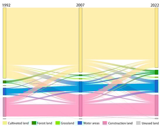 Based on the three periods of land use status in the Bahe River Watershed from 1992 to 2022, a land use transfer matrix was constructed, and the data were subjected to visual analysis (Figure 4 and Table 6). The data indicate that during the period from 1992 to 2022, the mutual conversion between cultivated land and construction land was particularly intense. The transfer-out amount of cultivated land was as high as 29.15 km2, of which 15.18 km2 was converted into construction land. In the coal mining subsidence areas, numerous villages were damaged and demolished, with the non-submerged portions being reclaimed as cultivated land after rehabilitation. From 1992 to 2022, a total of 15.37 km2 of construction land was converted to other land types, of which 9.35 km2 was transformed into cultivated land. This is driven by the reclamation and governance of land in coal mining subsidence areas [43,60]. Due to extensive water accumulation in areas with significant subsidence, the water body area in the study region rapidly increased. During this period, the water body area expanded by 12.88 km2, with cultivated land and construction land contributing the most to this conversion—9.39 km2 and 3.21 km2, respectively. From 1992 to 2007, under the influence of rapid urbanization development, a large amount of forest land was converted into cultivated land and construction land. From 2007 to 2022, due to the governance of subsidence water accumulation areas carried out in the study area and the establishment of several urban parks, the area of forest land was restored. Under the regulation of ecological restoration policies such as the “Planning for the Protection and Governance of Mine Geological Environment in Huaibei City”, some water areas and cultivated land were converted into forest land.
