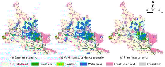 (2) Maximum subsidence scenario. The maximum subsidence scenario is built upon the baseline scenario. Based on the projected coal mining subsidence in the coming 15 years and the implementation of comprehensive governance in the coal mining subsidence area over the past 10 years, the conversion of cultivated land, forest land, grassland, construction land, and unused land to water areas within the future subsidence area is increased by 30%. Simultaneously, in the cost transfer matrix, the conversion of water areas with overly deep coal mining subsidence to other land types is restricted.