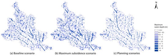 The MIKE 21 model was employed to simulate the water accumulation range and maximum water depth under the maximum subsidence, baseline, and planning scenarios for a 100-year design rainfall event in the study area (Figure 6). The Bahe River Watershed exhibits a relatively flat topography with minimal elevation variations, resulting in relatively uniform simulated water patches. Nevertheless, significant spatial heterogeneity persists in the water accumulation range across the different scenarios. Spatially, water accumulation under each scenario is predominantly distributed along the river system and its surrounding areas, forming a band-like pattern. This outcome arises because the elevation data for each scenario were pre-adjusted to account for the river network prior to simulation, causing substantial surface runoff to converge into the river following rainfall. Under extreme rainfall conditions, river overflow occurs, leading to increased water accumulation within the river system and its adjacent areas. Additionally, higher water accumulation is observed in areas with dense construction land and its surroundings across all scenarios, whereas cultivated land experiences relatively lower water accumulation over large areas. This phenomenon can be attributed to the prevalence of impervious surfaces in densely constructed areas, which hinder infiltration. In contrast, cultivated land has highly permeable soil, enabling rapid rainwater infiltration and reducing surface runoff. These findings indicate that different land use types significantly influence the spatial distribution of water accumulation.