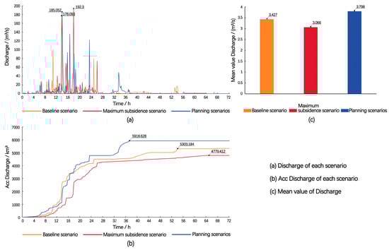 Based on the above analysis, the spatial distribution of the water accumulation range, maximum water depth, and water accumulation intensity in the watershed is closely related to land use types, elevation, mining activities, and planning policies. To further explore the hydrological response characteristics and inherent mechanisms of the watershed, we will conduct an analysis from the aspect of the numerical evolution of the outflow discharge at the watershed outlet. In this study, we utilized MIKE 21 (2024) software to export the runoff data of the watershed outlet for 72 h after simulating a 24-h designed rainfall and calculate its runoff characteristic values (Figure 7).