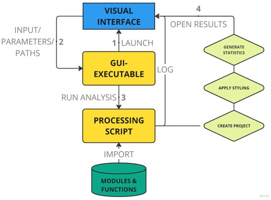 The application was iteratively developed to integrate a graphical user interface (GUI) with the hydrological processing pipeline. The GUI served as the central interface, linking user inputs to function parameters and triggering execution across the hydrological processing pipeline. It was developed with a modular architecture, where each script handled specific tasks within the application runtime. LLM-assisted scripting was used to generate and refine processing scripts, ensuring compatibility between modules. The application architecture is illustrated in Figure 1.
