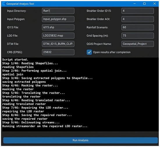 The developed application integrates a user-friendly interface from where the hydrological processing pipeline can be executed. Users can upload input files, define rainfall parameters, and configure visualization preferences. When run, the tool performs stream and catchment delineation as well as volume estimation based on the LDD, with progress shown in a log window. For the 29.63 km2 catchment, the analysis completed consistently around 30.31 s at a 1 m resolution (Hardware specifications: Lenovo Yoga, 12th Gen Intel(R) Core(TM) i7-12700H, 16 GB DDR5 @ 6000 MT/s), which is very effective compared to traditional GIS workflows that rely on manual processing. The output is a set of styled geospatial layers, prepared in a QGIS project file that opens upon completion for visual inspection and further analysis (Figure 2).