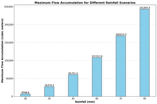Maximum flow accumulation was estimated for six simulated rainfall scenarios ranging from 15 mm to 90 mm (Figure 4). As expected, the accumulated volumes increased with rainfall intensity, with the relationship being nonlinear. This reflects how upstream runoff concentrates along shared flow paths, leading to exponential-like increases in volume at key accumulation points. The estimates offer a useful indication of how large an area contributes runoff to the AOI, supporting early-stage planning decisions when assessing cloudburst impacts.