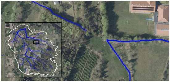 The employed static approach suits rural contexts, where little subterranean infrastructure like pipes, sewers, or bridges reduces modeling demands. However, stream breaks, likely from natural and artificial DTM depressions, act as “virtual holes” that disrupt flow continuity, directing water into dead ends. Although PCRaster’s lddcreate function applies sink filling, it fails to fully resolve these discontinuities, which can stem from LiDAR inaccuracies when penetrating vegetation and water bodies [12,26], as shown in Figure 5, or from interpolation artifacts during DTM creation [12,27]. While DTM resolution would theoretically impact stream delineation, little difference was observed during the project development, which used resolutions from 40 to 160 cm in a variety of catchments.