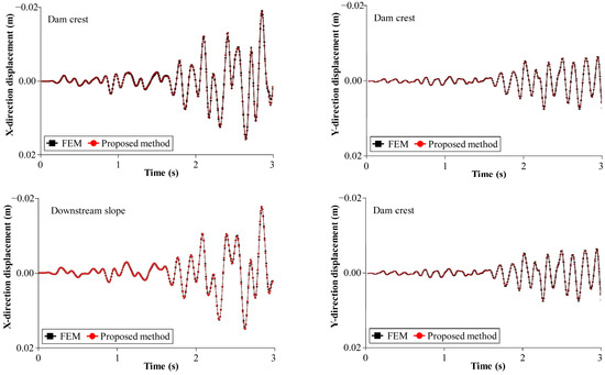The acceleration time history of the 1967 Koyna earthquake, applied at the dam–foundation interface, serves as the seismic input (Figure 3). Time-domain solutions, obtained via Newmark-β integration, show displacement time histories at the dam crest (max X: 4.2 cm) and downstream slope break point (higher Y amplitude), with SBFEM results matching FEM (discrepancies < 3%), confirming reliability for dynamic interaction analysis [24].
