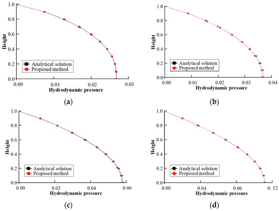 Water pressure on the Uttarakhand Dam under reflection coefficients. (a) a = 0.25. (b) a = 0.5. (c) a = 0.75. (d) a = 0.925.