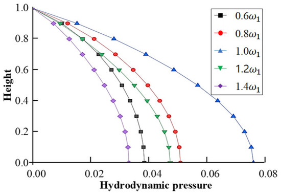 Figure 5 demonstrates the dynamic water pressure distribution across different excitation frequencies with a reflection coefficient of 0.75, indicating that resonance phenomena occur when excitation frequency coincides with the natural frequency (= 32.3135 rad/s), resulting in peak pressure concentration at the dam heel. This critical pressure amplification at the dam heel during resonance conditions is essential for evaluating dam safety under climate-induced high reservoir scenarios [13,25].
