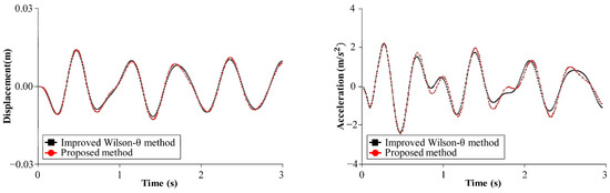 The Koyna Gravity Dam, located near Mumbai, India, is analyzed to further validate the proposed method. Previous research by Li et al. [18] utilized the modified Wilson- method and generalized Newmark-β methods, yielding consistent outcomes. Here, the modified Wilson- method serves as a reference for comparison. The dam has a height of 103 m, with the reservoir at full capacity. The dam material exhibits an elastic modulus of 31.5 GPa, a density of 2650 kg/m3, and a Poisson’s ratio of 0.17. The reflection coefficient at the dam base is 1.0, with water density of 1000 kg/m3 and a wave propagation velocity of 1430 m/s. A rigid foundation is assumed, and a sinusoidal acceleration excitation, , is applied in the downstream direction. The analysis uses a time step of 0.01 s over 300 steps. The displacement and acceleration time histories at the Koyna Dam crest are presented in Figure 7, showing SBFEM’s high consistency with the modified Wilson- method (discrepancies < 3%) [18]. This accuracy is critical for regions like Maharashtra, where climate change is projected to increase monsoon-driven reservoir levels by 10–20% by 2050, amplifying hydrodynamic pressures [13]. While field-measured displacement records for the Koyna Dam are limited, the simulated crest displacement of 4.2 cm under the 1967 earthquake aligns with historical estimates (3–5 cm) by Chopra and Chakrabarti (1973) [10], supporting SBFEM’s reliability for modeling non-linear responses under combined seismic and hydrological loads.