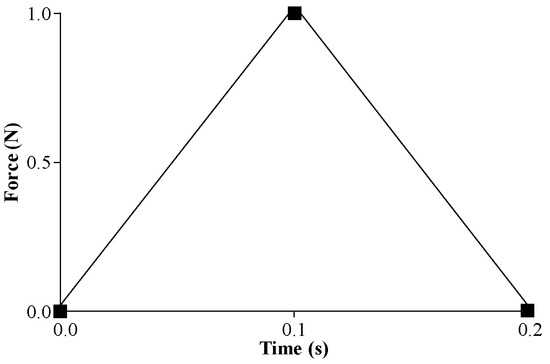 This study examines an infinite foundation (density 2000 kg/m3, Poisson’s ratio 0.25, elastic modulus 10 GPa). The foundation pit (139.5 m wide, 60 m deep) receives an impulse load at its center (duration 0.2 s, peak at 0.1 s, Figure 8), critical for probabilistic fragility assessments [25,26]. In the SBFEM approach, only the near-field and far-field interface is discretized, reducing computational complexity by up to 90% (e.g., 27 nodes vs. 1407 for FEM), enabling iterative simulations for fragility analysis of dam failure modes [26].