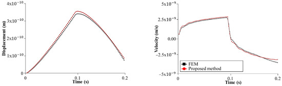 where, is the maximum wave speed, is the shear modulus (4 GPa), is the density, and T is the load duration. The wave speed is calculated as 1414 m/s, requiring a minimum boundary distance of 141.4 m. The FEM model uses a distance of 200 m, with a mesh width of 10 m, comprising 1407 nodes and 1320 4-node elements. In contrast, the SBFEM model requires only 27 nodes and 26 elements. Time-domain dynamic analyses (0.2 s, 0.002 s time step, 100 steps) show displacement and velocity at the foundation’s center (Figure 9). SBFEM results match FEM (discrepancies < 3%), supporting probabilistic hazard assessments with reduced computational effort [25,26].