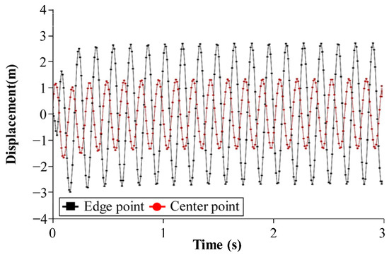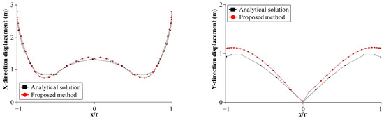 Dynamic analysis (3 s, 0.01 s time step, 300 steps) shows steady-state displacement amplitudes on the valley surface (Figure 11), with SBFEM aligning closely with analytical solutions (discrepancies < 5%). These results support fragility curves for seismic risk assessments [26]. X-direction amplitudes are nearly identical, while Y-direction amplitudes are slightly larger, showing effective radiation damping. A time-domain dynamic analysis is conducted over 3 s with a time step of 0.01 s (300 steps). The steady-state displacement amplitudes on the valley surface, compared with analytical solutions in Figure 11, show that SBFEM results closely align with analytical trends. The maximum and minimum amplitudes in the X direction are nearly identical, while Y-direction amplitudes are slightly larger, demonstrating SBFEM’s ability to simulate radiation damping effectively.