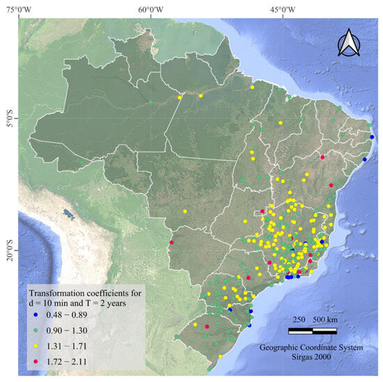 - Carvalho Abreu, M.; Thebit de Almeida, L.; Bernardes Silva, F.; de Souza Fraga, M.; Bastos Lyra, G.; Souza, A.; da Silva, D.D.; Avelino Cecílio, R. Disaggregation Coefficients for Obtaining Rainfall Intensity-Duration-Frequency Curves: Concepts, Models, Errors and Trends in Minas Gerais, Brazil. Urban Water J. 2023, 20, 1647–1660. [Google Scholar] [CrossRef]