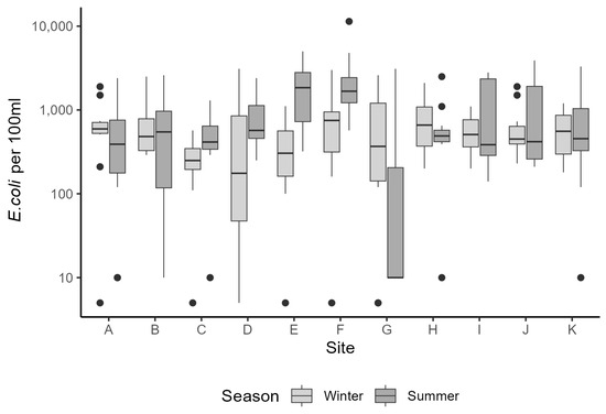 Each site was sampled 12 times per sampling period. The E. coli concentrations at each sampling site are presented for the winter and summer periods in Figure 3, and as winter and summer time series (see Supplementary Materials Figure SD1). E. coli concentrations were variable across sites and sampling periods, with between-site variability being more pronounced for the River Taw sites (A–G) than for the River Torridge sites (H–K). Winter median count was highest at Site F (750; interquartile range: 318 to 960) and lowest at Site D (180; interquartile range: 76 to 890), with considerable variation between sampling timepoints and a maximum count of 3100 at Site D at the first timepoint on 10 January 2023 (Figure SB1). Summer E. coli counts tended to be higher and more variable than winter counts. Median summer count was highest at Site E (1850; interquartile range: 738 to 2800) and lowest at Site G (10; interquartile range: 10 to 178), again with considerable variation between sampling timepoints and a maximum count of 11,400 at Site F on 20 June 2023.