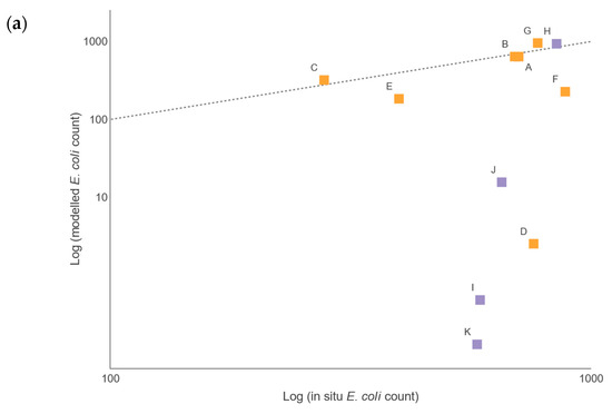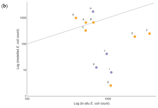 Comparison between simulated (monthly) bacterial counts estimated by the SWAT models and observed bacterial counts measured at the respective Taw (orange) and Torridge (purple) sample sites (see Figure 1 for locations of sites A–K): (a) winter; (b) summer. The reference line (dotted) indicates when the modelled and in situ values are identical.