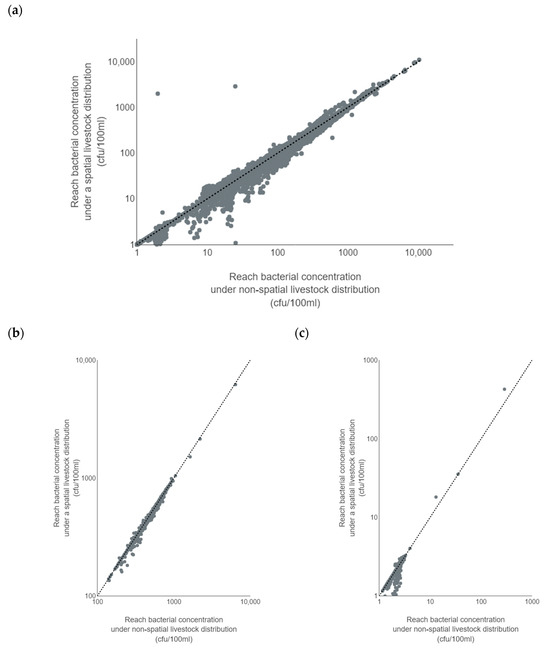Comparisons between simulated bacterial loads arising from spatial versus non-spatial apportionment of livestock in the catchment model: (a) across all river reaches in the Taw SWAT model; (b) at Site A; (c) at Site D. The reference line (dotted) indicates when the modelled and in situ values are identical.