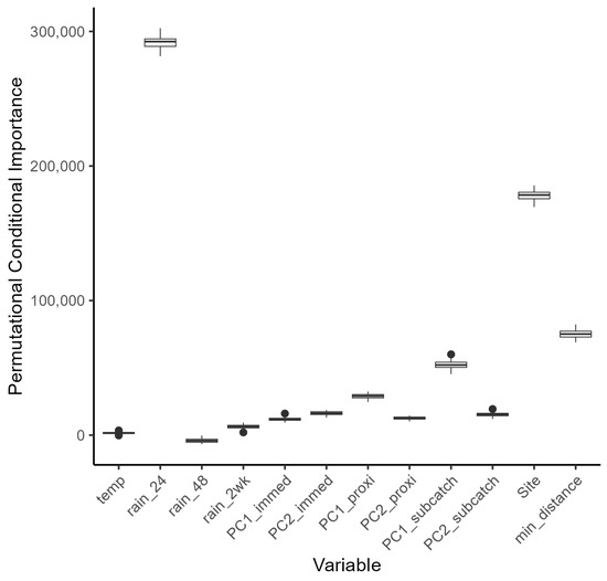 Conditional Random Forest regression models were used to infer the importance of the same 12 variables used in the LMMs for predicting the concentration of E. coli. The procedure used followed that of Strobl et al. (2008) [52], and was implemented in R version 4.2.2 using the cforest() function of the ‘party’ package, version 1.3-15 [53].