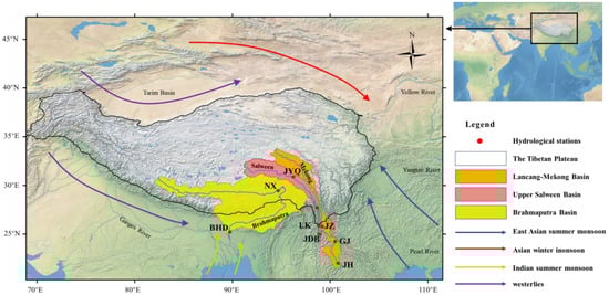 - Hydrological data: Daily discharge data from 9 hydrological stations in the three study basins were employed for hydrological model calibration. The data periods for each station were as follows: JiuZhou, Gajiu, and Jinghong in the Upper Mekong basin (1991–2009); Liuku, Jiayuqiao, Jiedaoba, and Gongshan in the Upper Salween basin (2000–2012); and Nuxia and Gongshan in the Brahmaputra River basin (1983–2015).