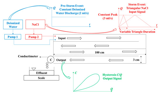 At the channel output, a conductimeter and a scale give the measurements of NaCl concentration and discharge of the effluent. The measurements are performed at the time interval of 1 s and are stored on a datalogger (Campbell Scientific CR1000, Loughborough, UK). The measurements at the channel output permit obtaining the C/Q hysteresis relationship of the output signal as a response to the NaCl triangle input signal at the channel input.