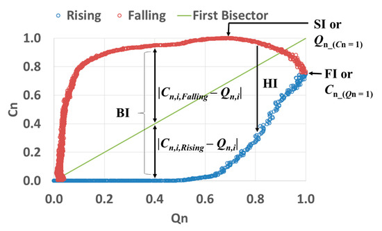 where Cn,i,Rising and Cn,i,Falling are, respectively, the normalized concentrations of the rising and falling limbs of the hysteresis at timestep i (Figure 2). Equation (2) is the most used formulation of HI since [24].