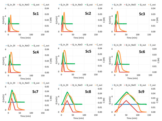 For the nine tested scenarios, experimental curves of discharge and concentration at both channel input and output are shown in Figure 3.