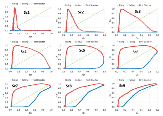 C/Q normalized hysteresis relationships for the nine tested scenarios. Blue: hysteresis rising limb. Red: hysteresis falling limb. Green: the first bisector. These C/Q hysteresis relationships are the ‘output signal’ measured at the channel output as a response to the ‘input signal’ (NaCl triangular storm event) imposed at the channel input.