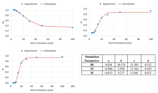 where a, b, c, and d are simulation parameters, T (min) is the storm duration, and Index could be BI, FI, or SI. The c parameter represents the threshold of the Fermi function. The parameters (a, d) are dimensionless, and the parameters (b, c) are in minutes.