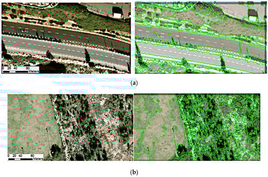 Figure 4a. In natural open areas where the land cover consists of patches of bare soil, rock, and shrubs, the segmentation process delineated each of these objects separately, as they have different properties (