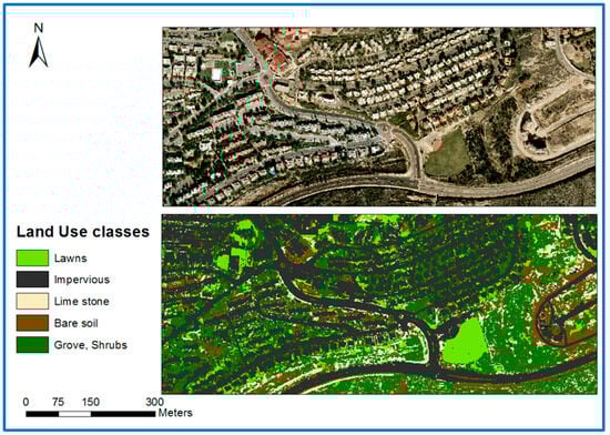 Thirteen classes were defined to obtain an accurate classification, enabling distinguishing between features of a single LU type with many different appearances, such as red roofs, gray roofs, and roads, which are three different classes that are classified and later merged into a single impervious area LU class. The feature extraction procedure is run in parallel for LU classification. A post-processing stage included manual correction of classification errors using vector GIS data. Buildings classified incorrectly as open areas were changed to impervious areas via an intersection with the building layer, while open area patches incorrectly classified as impervious areas were changed into bare soil. The manual correction served as a tool for validating the classification results. An LU classification map was created, containing the following five LUs: Impervious surfaces, Lawns, Groves, Bare soil, and Limestone (