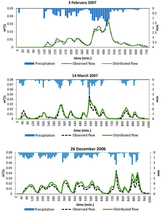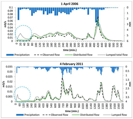 Figure 7) indicate that the initial rise of the lumped hydrograph (marked with a blue dashed circle) is an immediate response to the first rain input. The observed hydrographs, however, are delayed and rise only later after more rain has accumulated and the initial abstraction has been satisfied. The distributed hydrograph’s first response timing and magnitude better fit the observed flow.