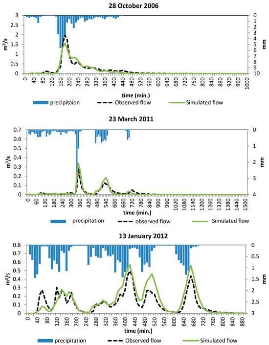Table 1), runoff depth deviation percentage, and peak discharge deviation percentage. A comparison of the simulated and observed hydrograph fit using the NSE coefficient revealed that the results were satisfactory, with an NSE ranging from 0.62 to 0.95. The performance indicated by the runoff depth D% is rated good to satisfactory, with a range of −12.91% to +32.08%. As the events have multiple peaks, the peak discharge deviation percentage compares the highest observed peak to the simulated peak simultaneously. The peak discharge deviation percentage ranged from −35% to −4%.