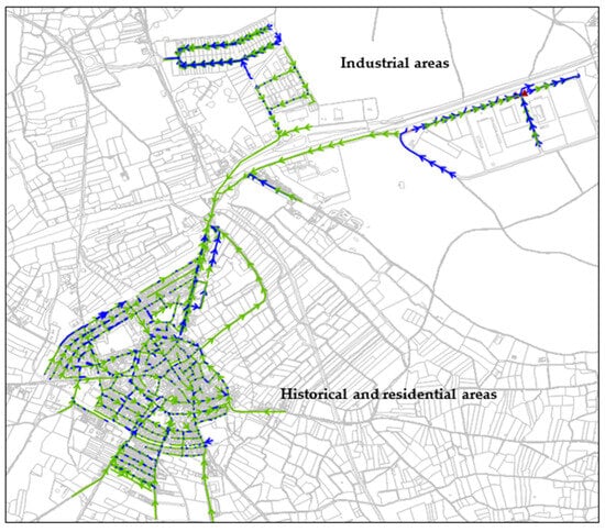 Overview of the sewer network. Total area is 97.6 ha. The system comprises an urban area with historic and residential zones and two industrial sectors located at the north-west part of the study area. Blue indicates storm water system and green indicates combined system. The arrows represent pipe slope/direction of flow.
