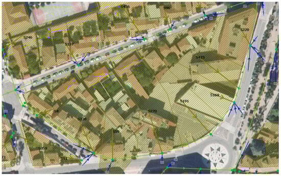 As previously mentioned, the model considers that the rainfall over the buildings is collected and introduced directly into the pipes through the manholes. In terms of 2D mesh generation, this means the polygons representing the buildings are treated as voids (Figure 3). On the other hand, rainfall is applied directly on the 2D zone (2D mesh), and runoff generated by rainfall and spills from the network is circulated within the 2D zone formed by streets, sidewalks, and squares.