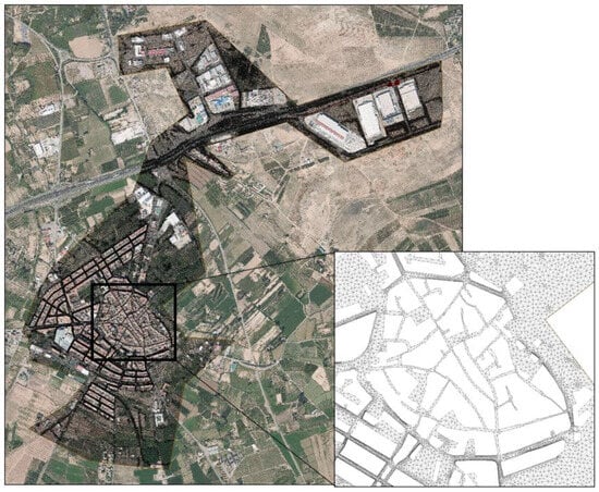 Comprehensive physical data related to the sewer system—manholes, pipes, weirs, and pumps from both the primary and secondary networks—were supplied by FACSA (Zaragoza, Spain), the utility company responsible for managing La Almunia de Doña Godina’s sewer infrastructure. These datasets were verified and incorporated into the hydraulic model. The final network consists of 1869 nodes, 1879 pipes, and 2 pumping stations. Pipe diameters range from 100 mm to 2700 mm, with a total network length of 45.9 km. The pipes are constructed primarily from concrete and PVC. The general view of the system is shown in Figure 1.