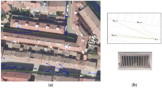 Partial view of sewer network with drain inlets (a); detail of inlets connections to a manhole and type of inlet grate (b). The arrows represent pipe slope/direction of flow.