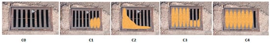 The C0 pattern represents a ‘clean’ inlet grate. As said, to simulate varying degrees of clogging (C1, C2, and C3), parameters A and B are adjusted based on the geometry of each grate and the clogging patterns observed across the seven inlet types. C4 was disregarded after a sensitivity analysis—as will be discussed later in this article—because of the low occurrence in field observations. An example of the physical representation of these patterns is shown in Figure 7.