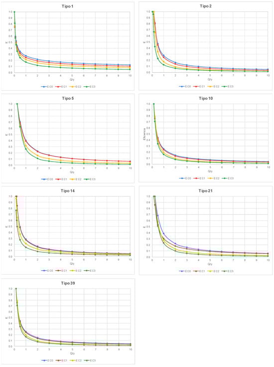 The reduction in the available void areas of inlets clearly leads to a decrease in hydraulic efficiency, which is calculated with Equation (2) and plotted below for the seven grated inlet types (Figure 8).