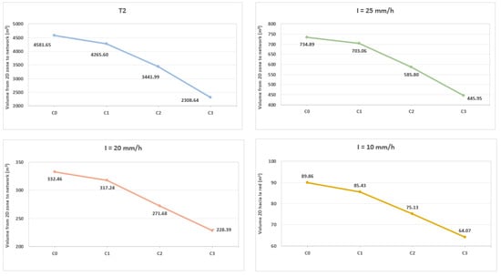 The output from the model indicates a significant decrease in the amount of runoff drained by the inlets as the clogging coefficients increase. Table 6 presents the runoff volumes entering the sewer system through the inlets according to the degree of clogging (C0, C1, C2, and C3).