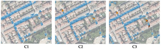 To provide a concrete visual representation of these effects, Figure 10 focuses on a representative street segment within the study area. In this figure, it is possible to observe how the extent of surface flooding increases progressively as the level of inlet clogging intensifies. The increase in the number of 2D mesh cells showing water depths above the threshold of 1 cm clearly demonstrates the reduced capacity of the drainage system to evacuate surface water under obstructed conditions.