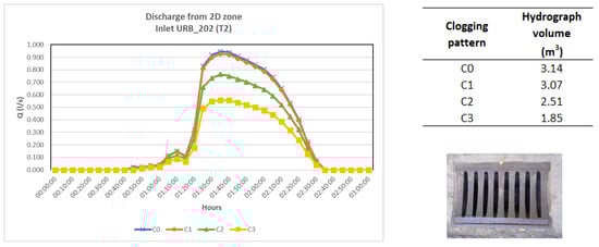 Discharge hydrograph for inlet URB_202 (grate type 14); rainfall with return period (T) of 2 years; clogging patterns C0, C1, C2, C3.