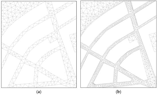 Detail of the 2D mesh without break lines and minimum element size of 25 m2 (a); detail of the 2D mesh with break lines and minimum element size of 5 m2 (b).