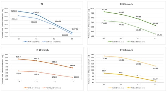 Figure 13 shows the plotted values for all rainfall events with break lines and without break lines. As expected, in all cases, volumes are higher on the more detailed mesh, as the runoff is more confined to the street limits.