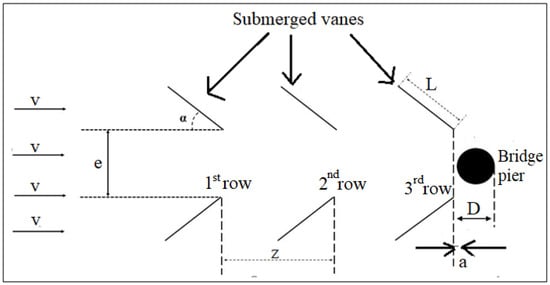 The pier diameter was ; the median sediment size was ( where denotes the standard deviation of the grain-size distribution). Hydraulic conditions were held constant across all experiments: flow depth , discharge , and Froude number . The vane geometry consisted of length and height –, installed in three rows (layout and dimensions shown in Figure 1).