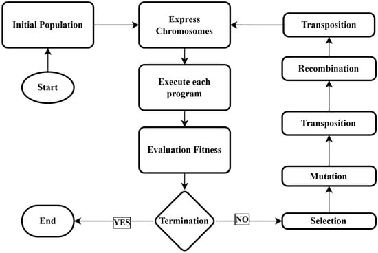 We employ gene expression programming (GEP) [47] as a symbolic regression tool to learn the mapping in Equation (2), from the four inputs to the response , and to obtain an explicit closed-form relation. GEP was implemented in GeneXproTools 4.0 on the same 70/30 train/test split described in Section 2.1. The overall flow of GEP is shown in Figure 3, and the expression tree of the best individual is shown in Figure 4.