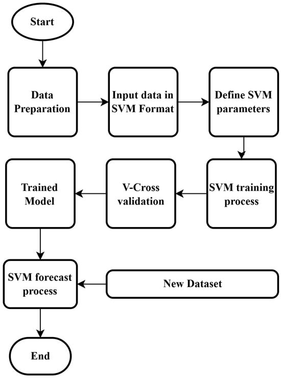 We use –support vector regression (SVR) [48] to learn the mapping in Equation (2) from the four inputs to the response . All experiments share constant hydraulics (Section 2.1), and the inputs are dimensionless; no additional feature scaling was required. SVR was trained on the same 70/30 train/test split as the other models, and its skill is reported in Table 3. Figure 5 presents the workflow of the –SVR used in this study.