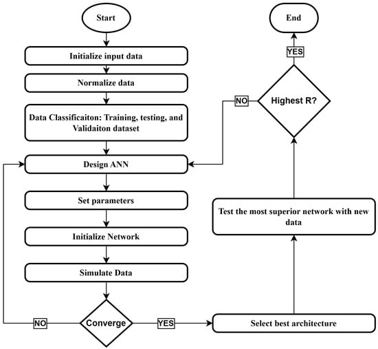 In Figure 6, R denotes the Pearson correlation coefficient between the ANN’s predicted and observed on the validation set, and the decision step “Highest R?” corresponds to selecting the architecture with the most extensive validation R (equivalently ), subject to consistency with RMSE/MAE.