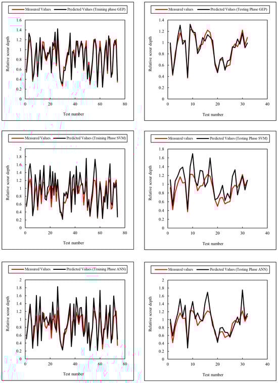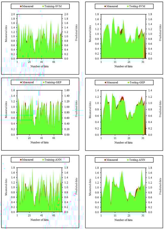 To facilitate a more qualitative comparison among the outputs of the three models, Figure 12 illustrates the extent of concordance between observational and computational data during the training and testing phases. It is evident from these figures that the discrepancies between observed and predicted values are significantly greater in the SVM and ANN models compared to the GEP model.