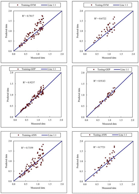 During the training phase, the optimal GEP model yielded the following metrics: RMSE , MAE , , and . Subsequently, during the testing phase, the model maintained high performance with RMSE , MAE , , and . These results confirm that the GEP model outperforms the SVM and ANN models.